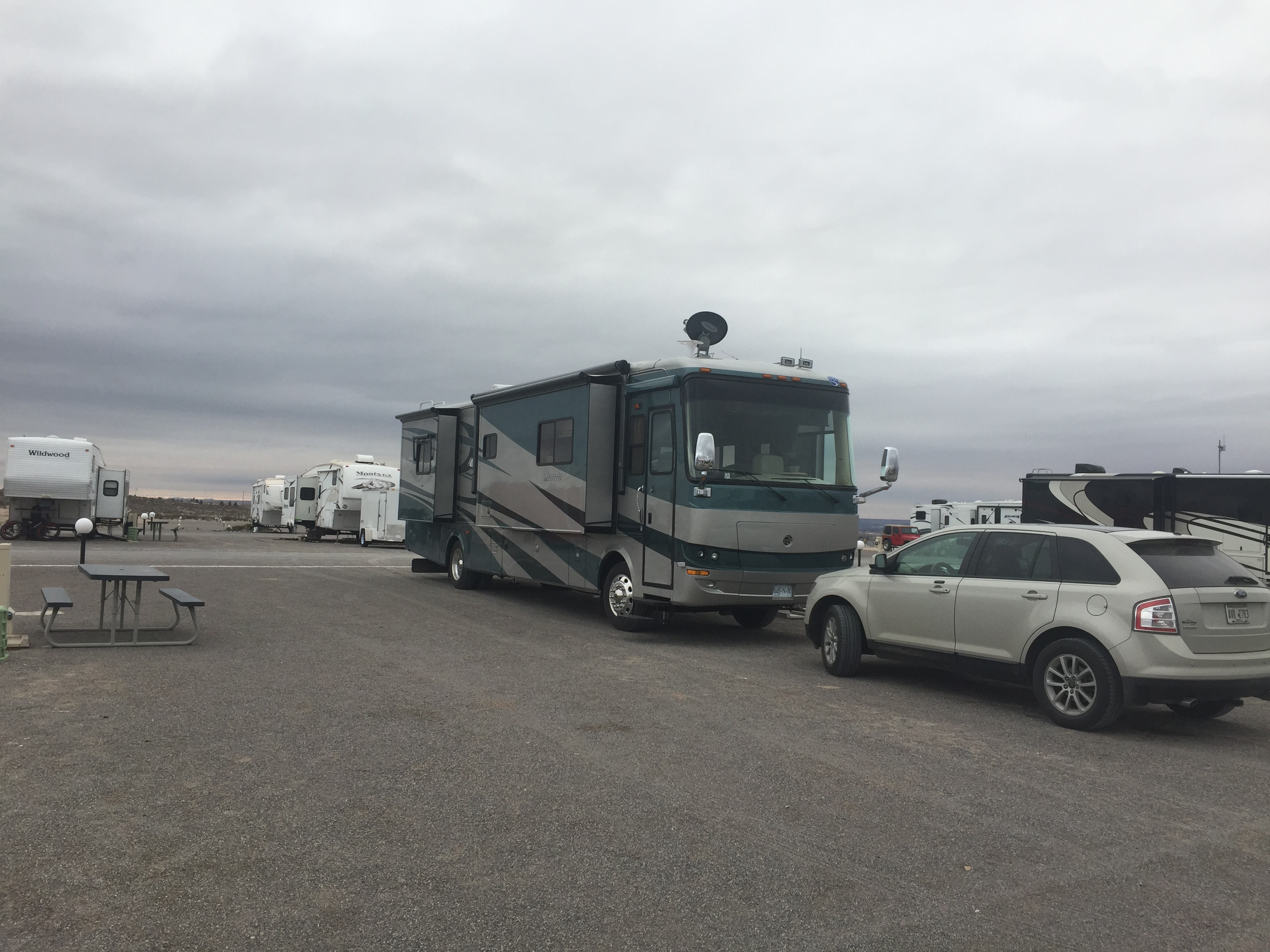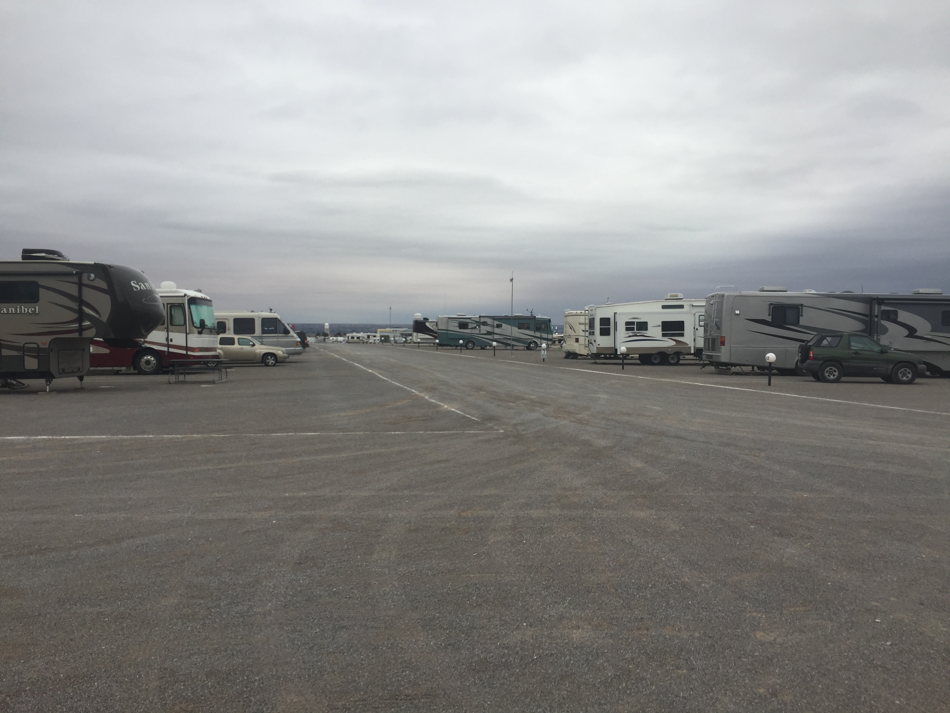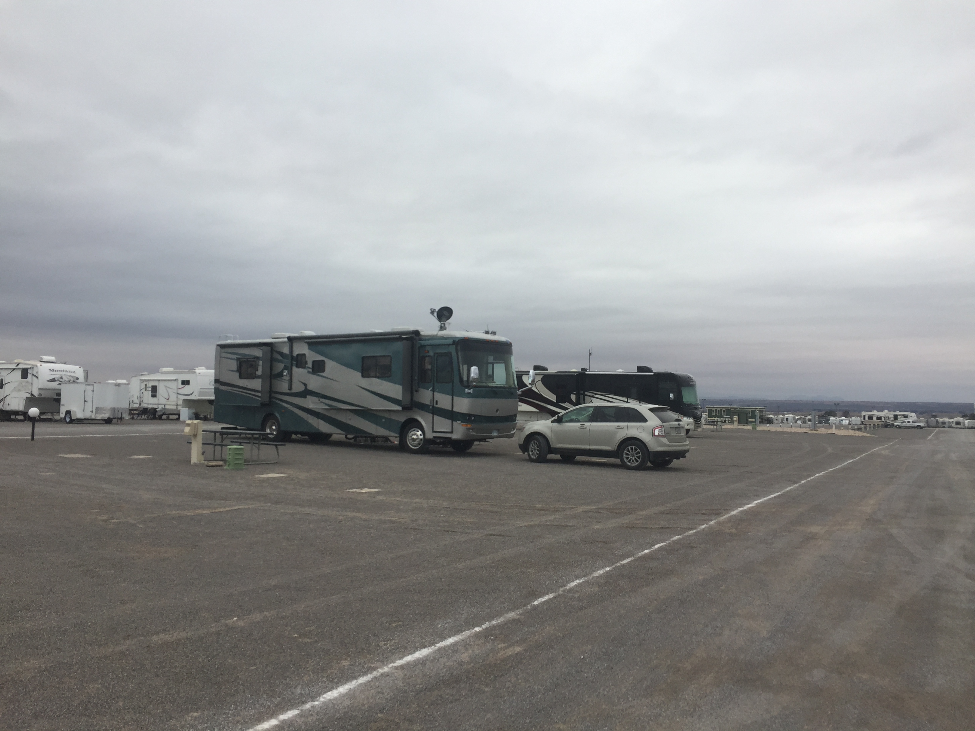 Setting: This campground used to be the American RV & Marine Resort Rally Campground. This is a very large facility and could accommodate any size RV, the hook-ups are modern and spaces are very wide and long. Only one section was open when we checked in and the office is a ‘temporary’ modular building. Camping World store is located on across the street and Flying J is conveniently located as you make your way back to the interstate. Although the hook-ups are excellent, this campground is just a large gravel parking lot with virtually no landscaping. The view of the mountains is quite dramatic, however.