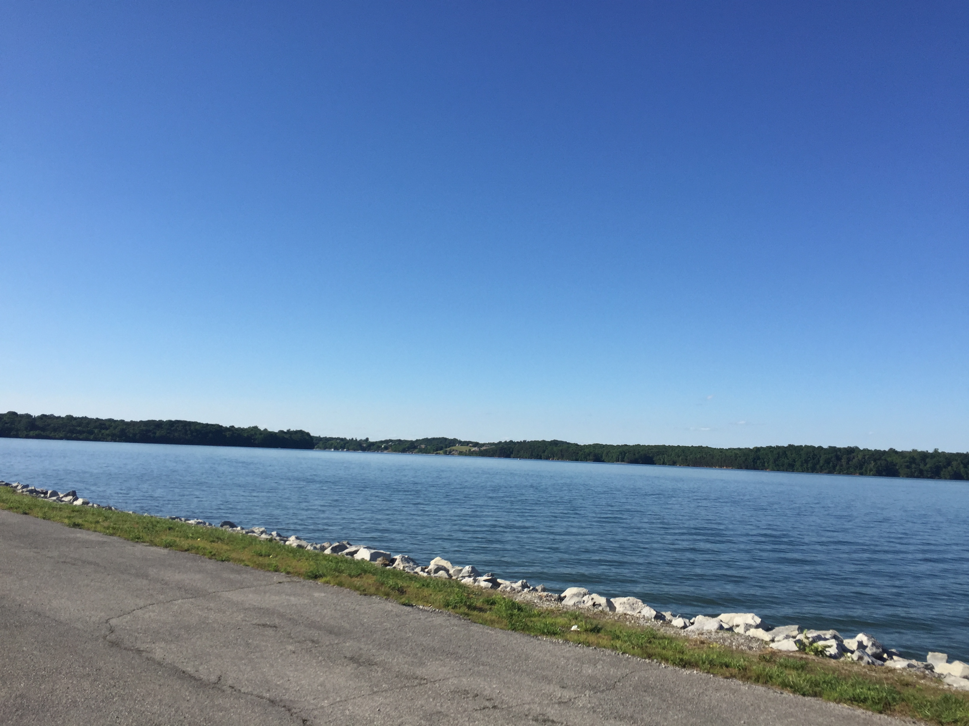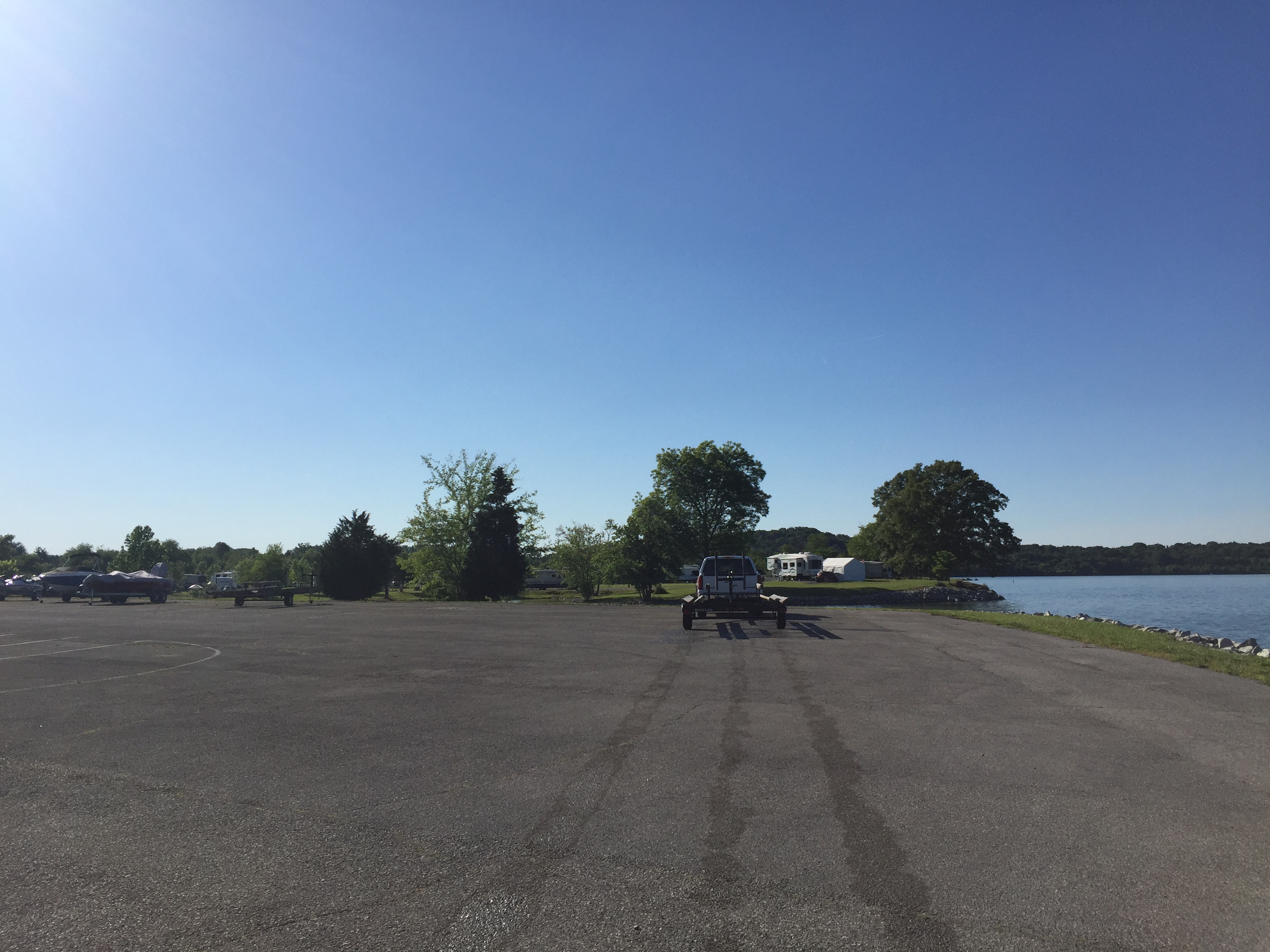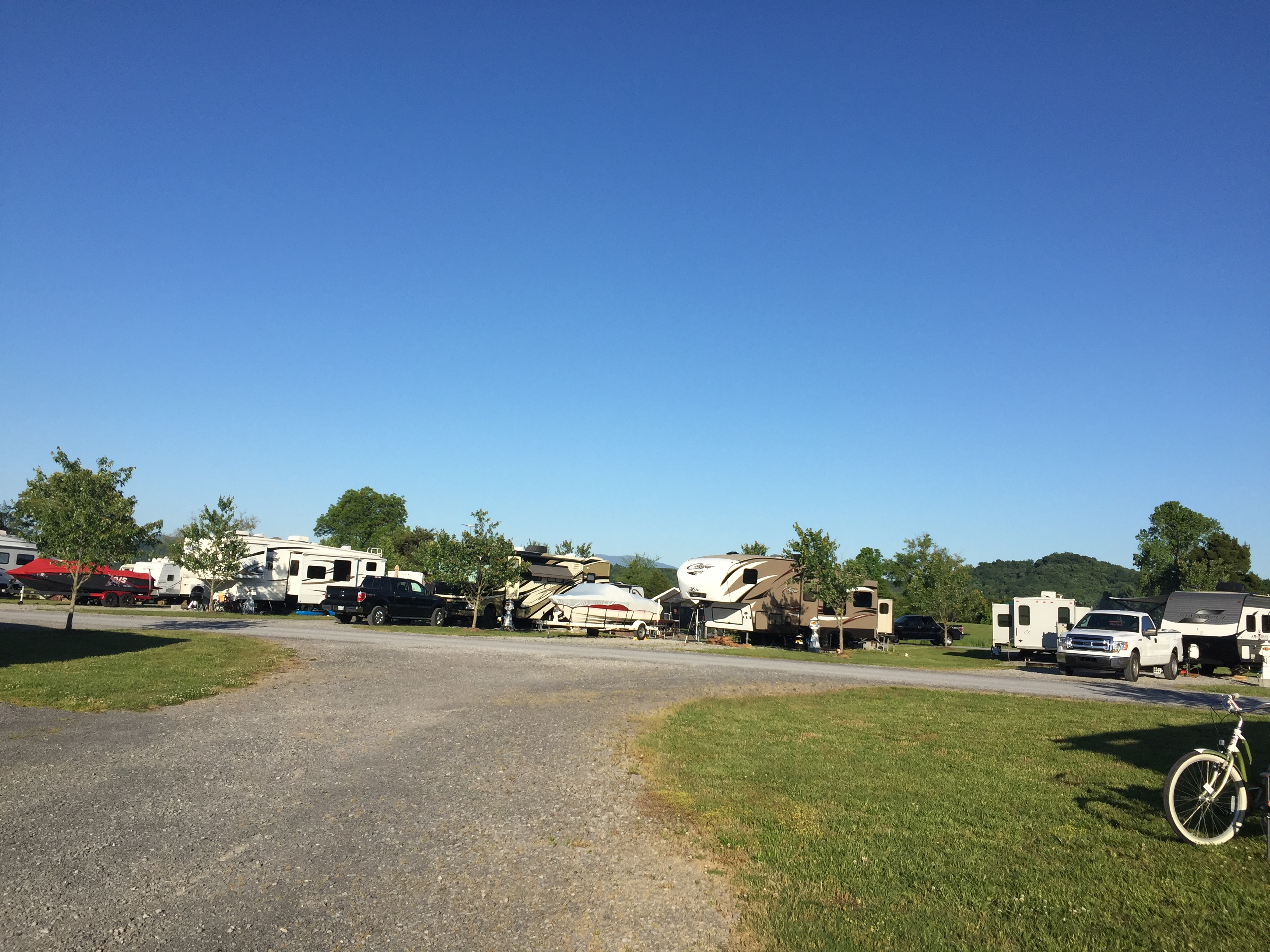 Setting: Tennessee Reservoir Development Agency campground on Tellico Lake. Sites are level gravel with grass between sites. Picnic tables and fire rings at each site. Utilities nicely placed and work well. Park is new so no shade until trees grow up. There is a nice fishing pier and a small beach and lake swimming area. There is a small store with some supplies and miscellaneous foodstuffs, bait, and ice. Sites are about 1/2 seasonal – all lakefront sites are taken with longer term rentals but available sites still offer decent views of lake with Smokey Mountains in the distance and across the road lake access. Location is secluded – approximately 4 miles to nearest town and 10 miles or so to nearest major shopping (grocery, Wal-Mart).Entrance is gated (gate closed after 10 pm). We were there after school started (off season) so not very busy and very quiet. There is a small store with some supplies and miscellaneous foodstuffs, bait, and ice. Satellite TV great, antenna TV fair.