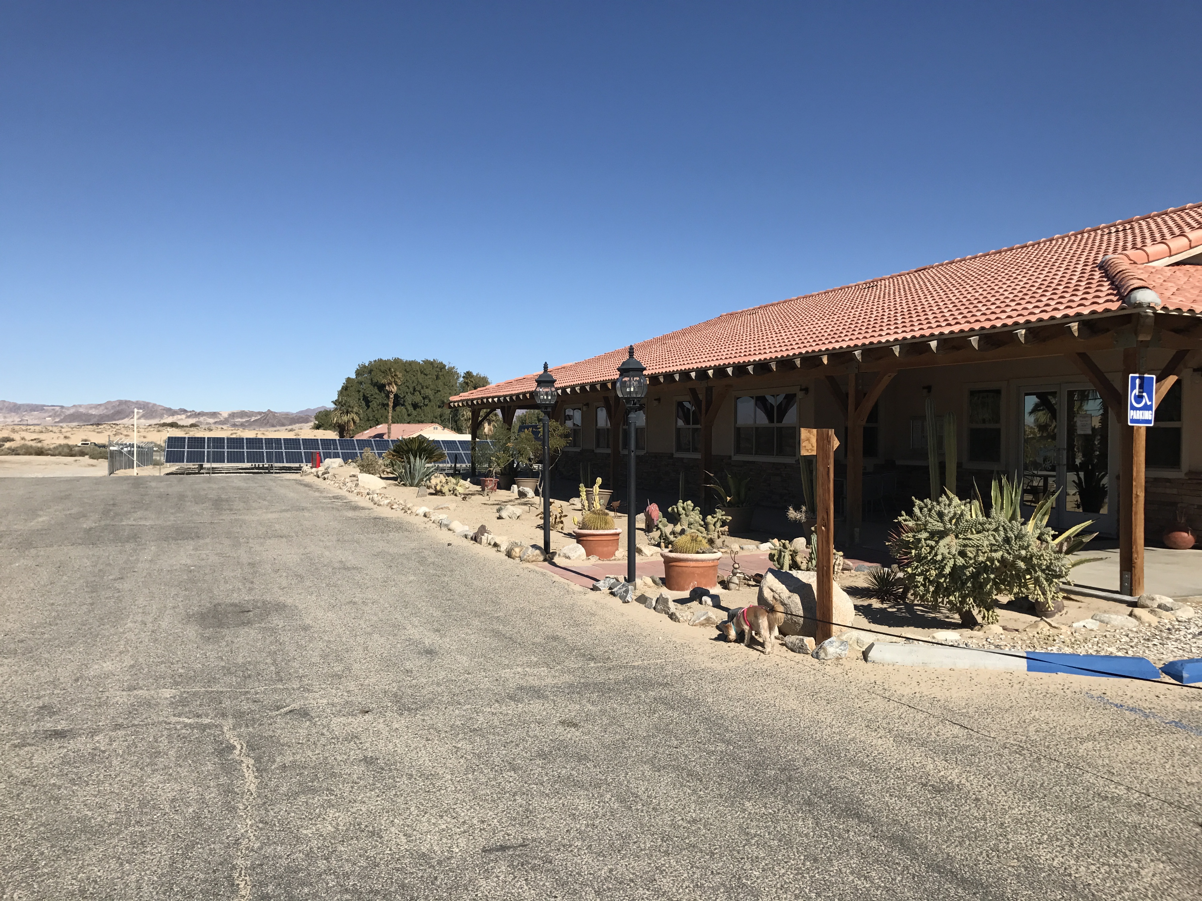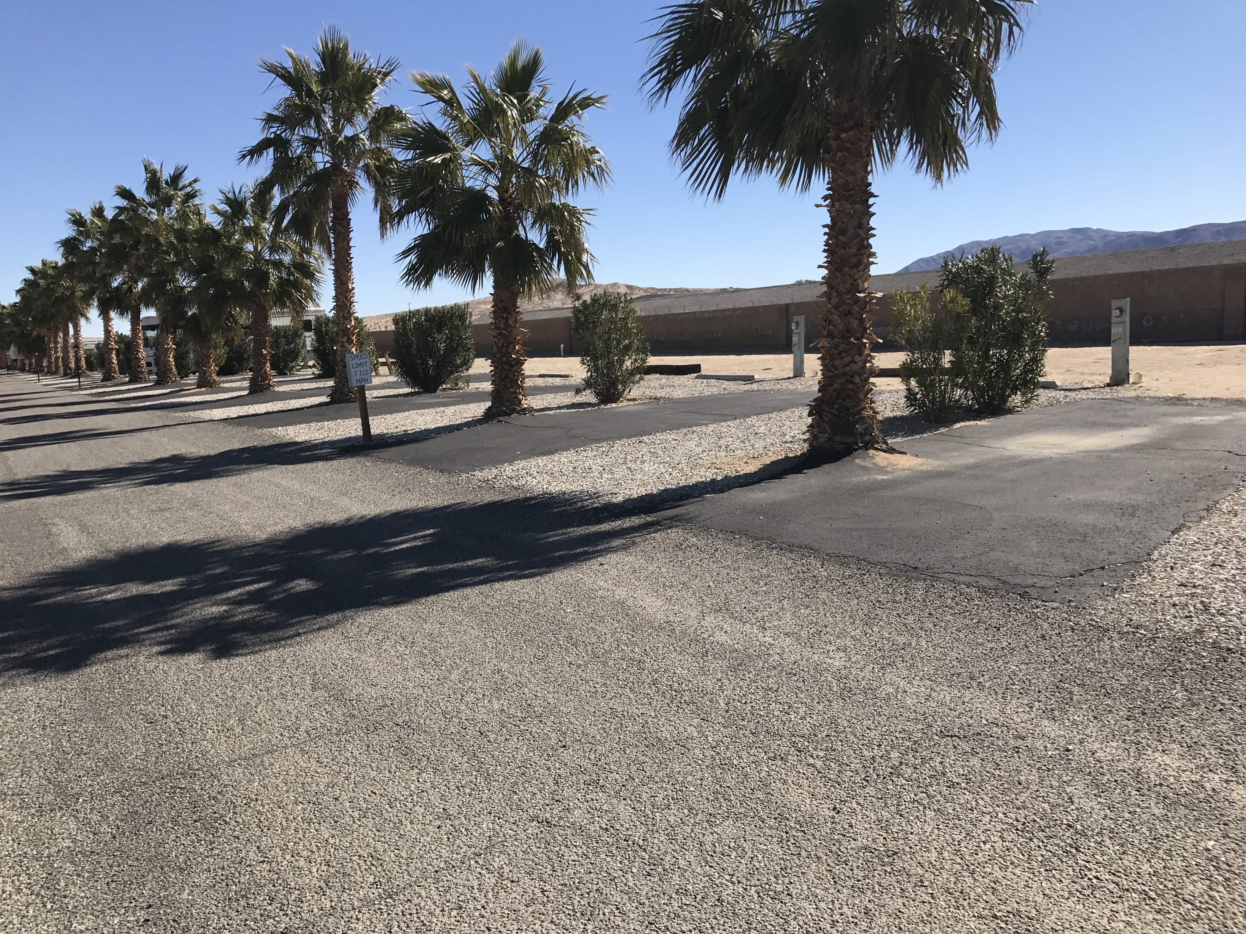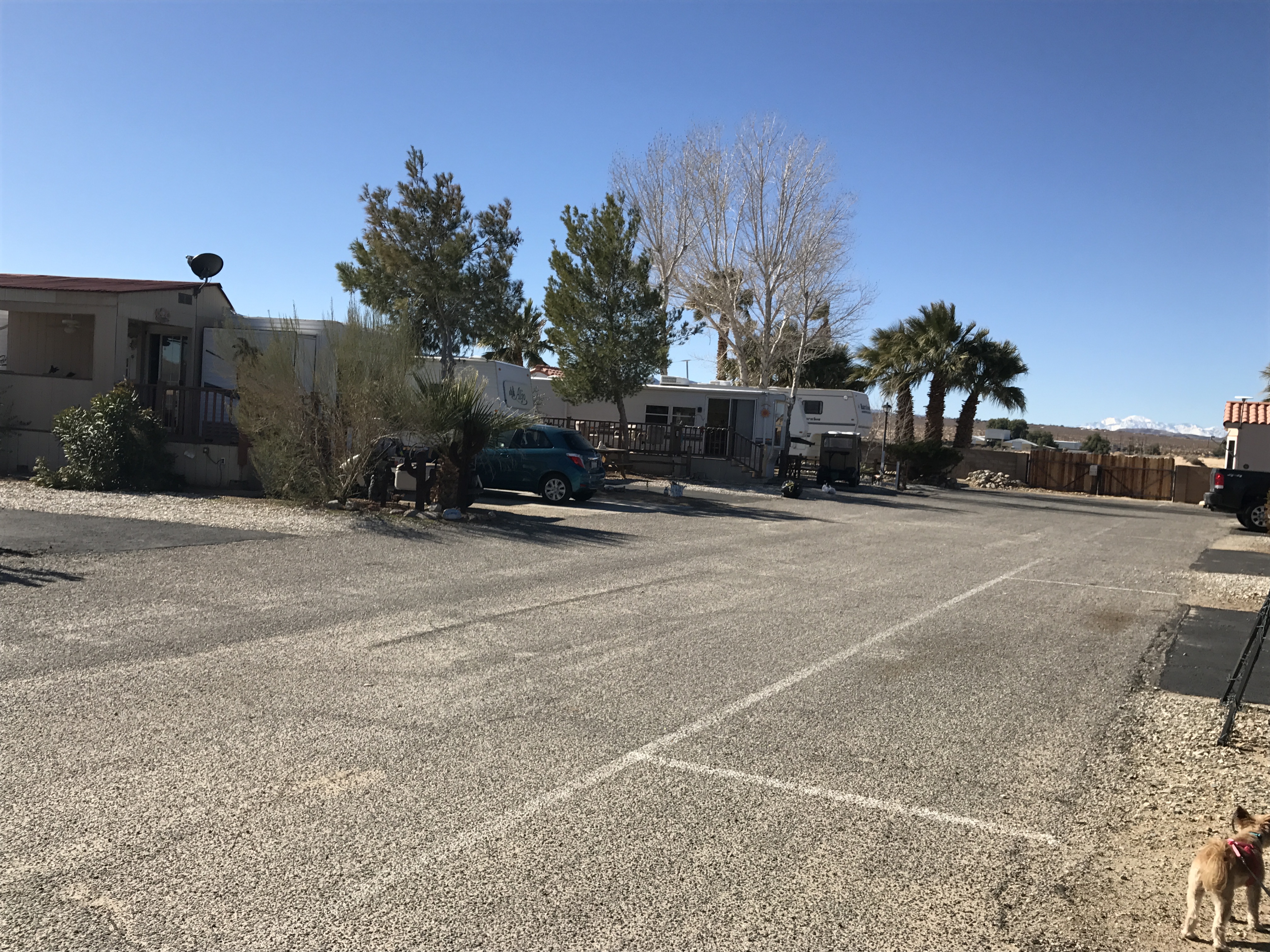 Setting: Pull-through sites are spacious, but are away from all the amenities. There’s a good sized indoor pool, an hot tub, exercise room, tennis, shuffleboard and game room. A dog park, but it’s at the farthest point in the park, and all sand. They advertise WiFi at the sites, but nothing works except the office connection in the front. Sites are gravel, but the patio is concrete. Location is is near Joshua Tree National Park.