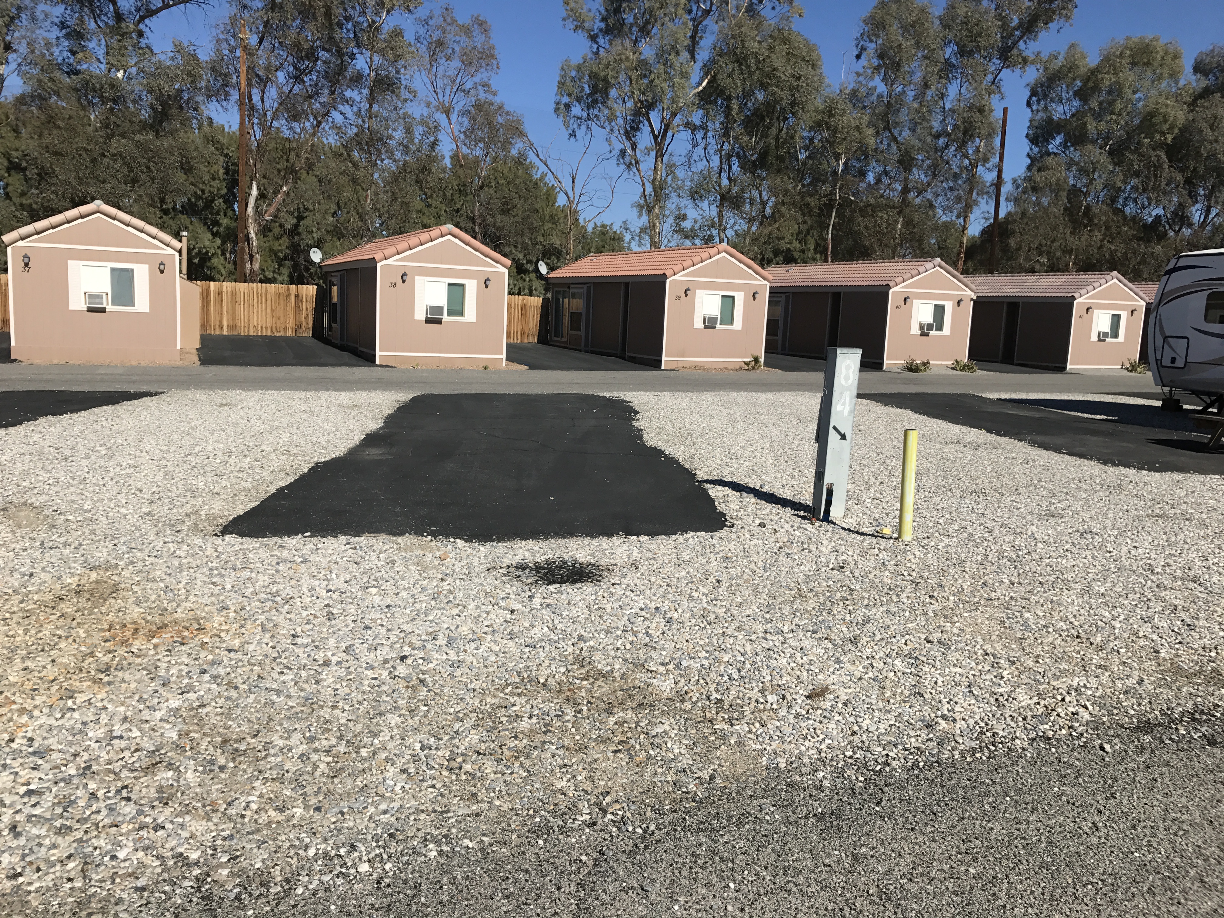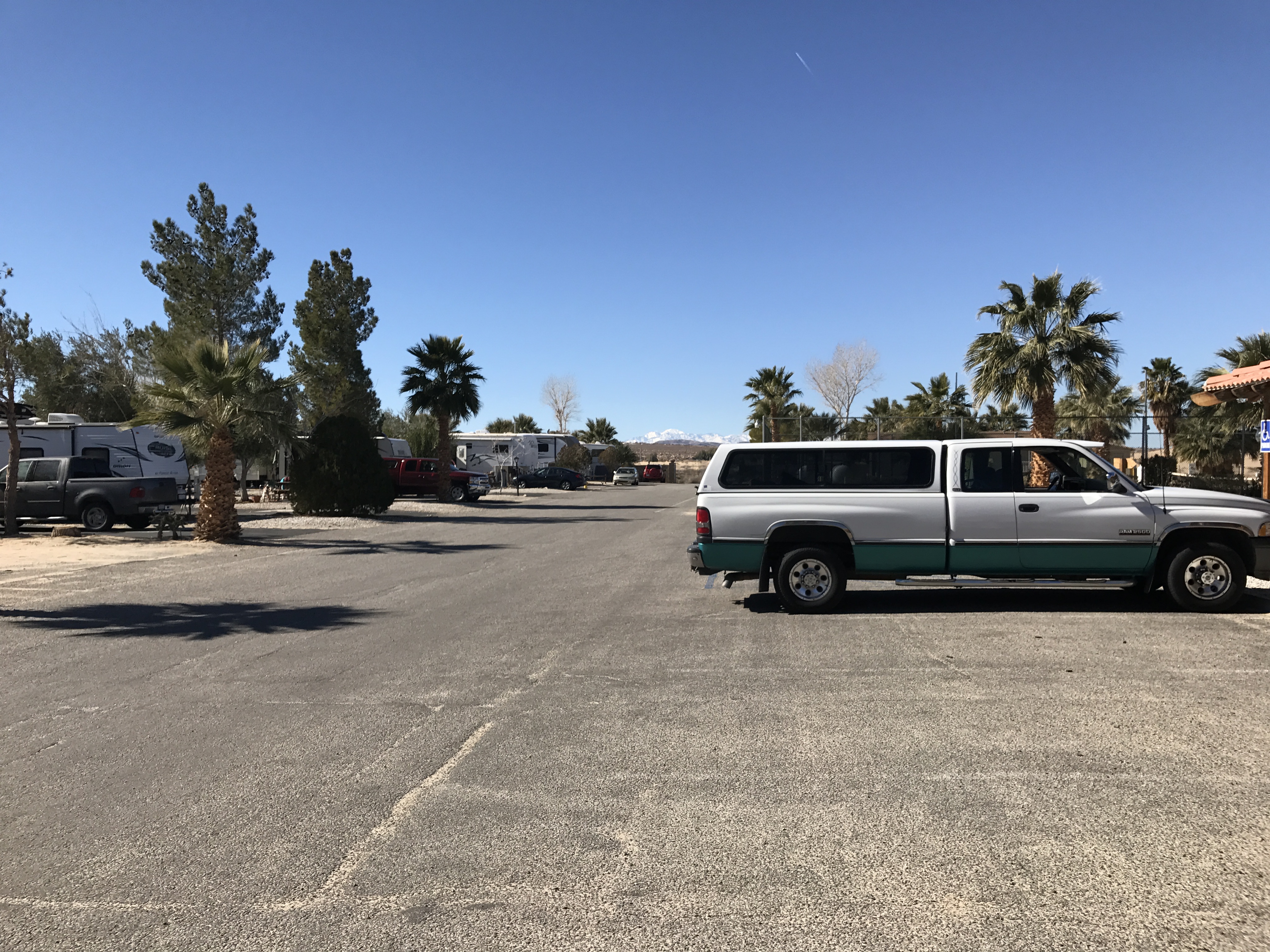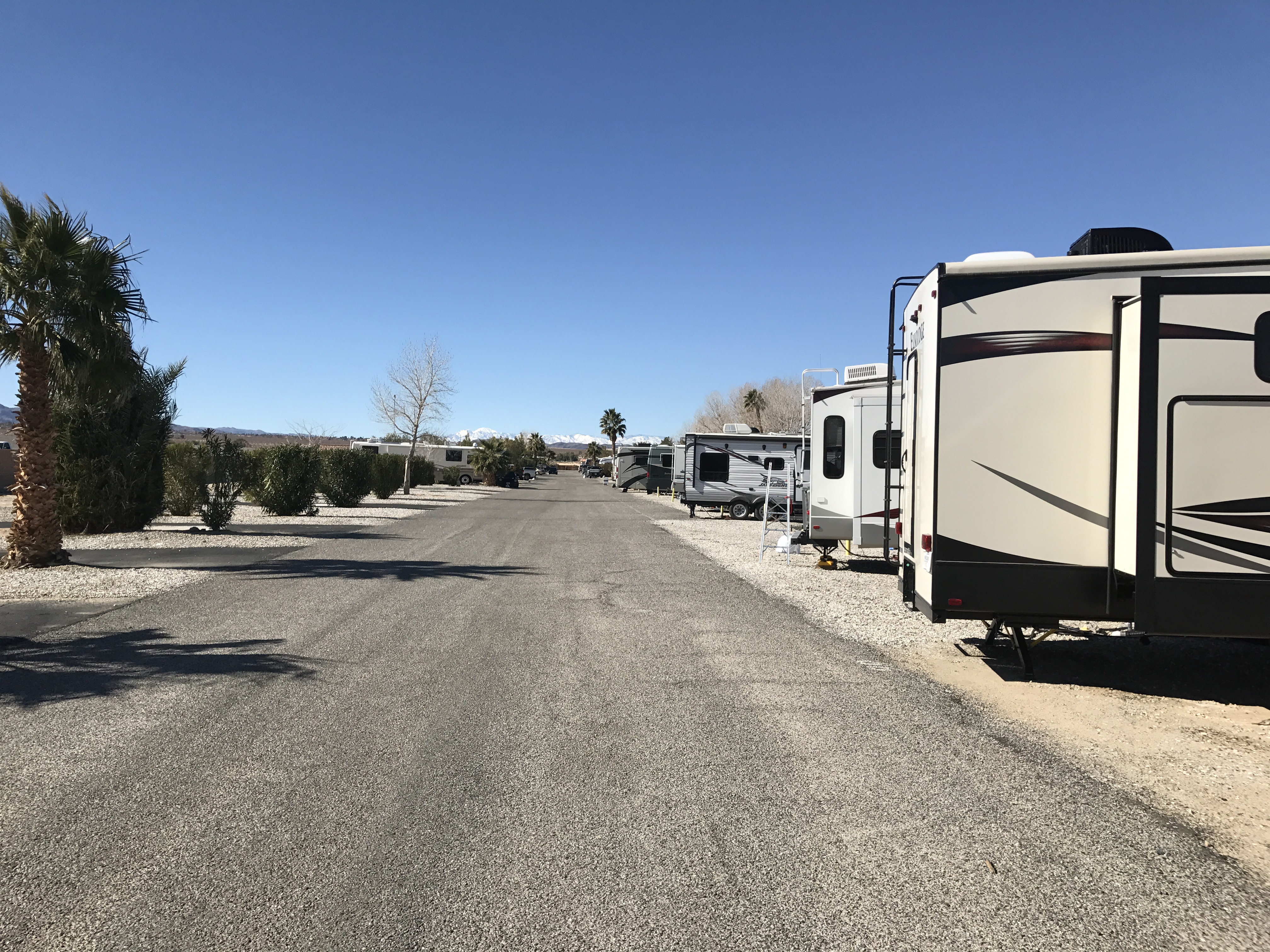 Setting: Pull-through sites are spacious, but are away from all the amenities. There’s a good sized indoor pool, an hot tub, exercise room, tennis, shuffleboard and game room. A dog park, but it’s at the farthest point in the park, and all sand. They advertise WiFi at the sites, but nothing works except the office connection in the front. Sites are gravel, but the patio is concrete. Location is is near Joshua Tree National Park.