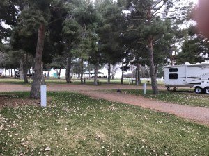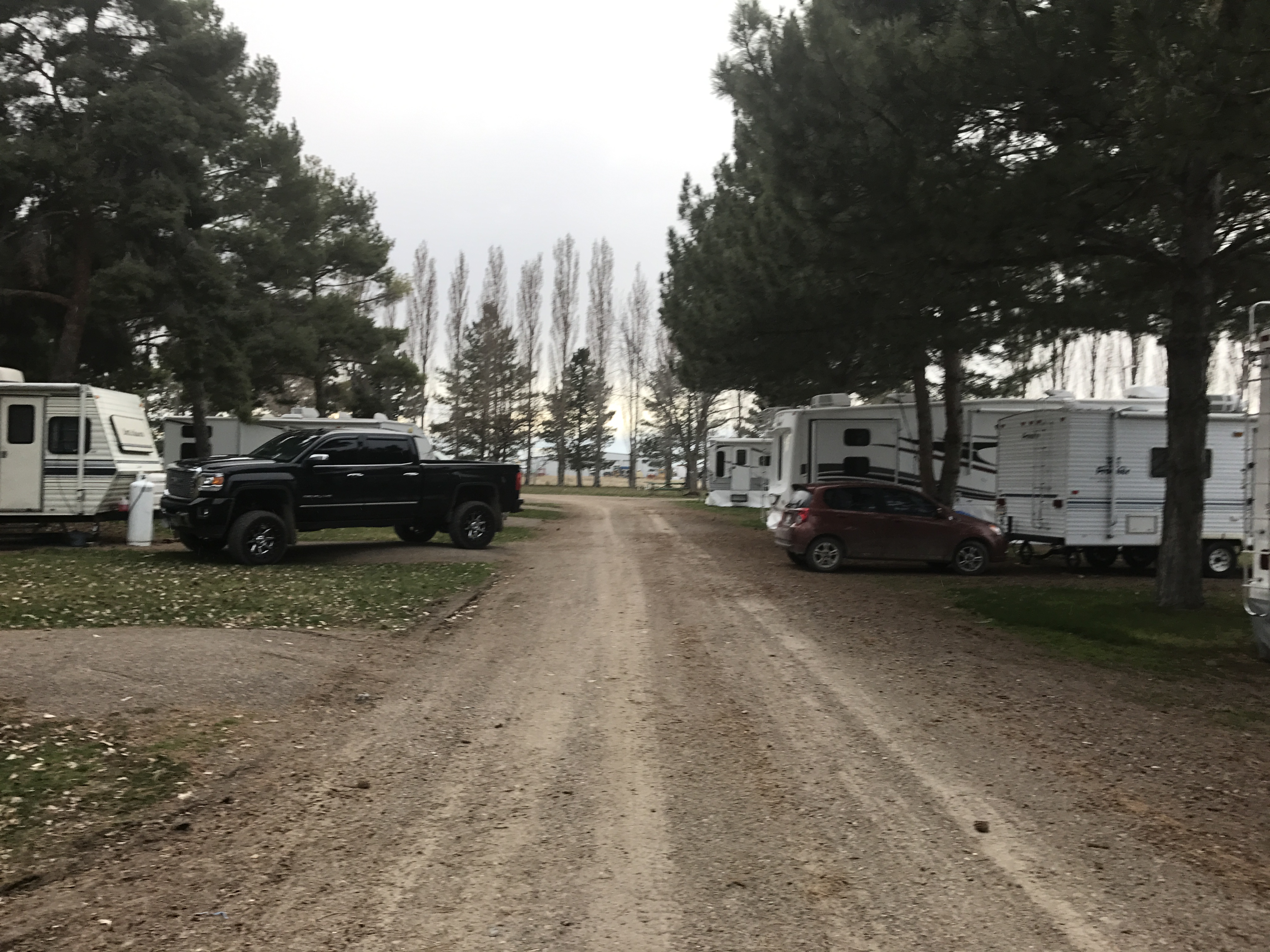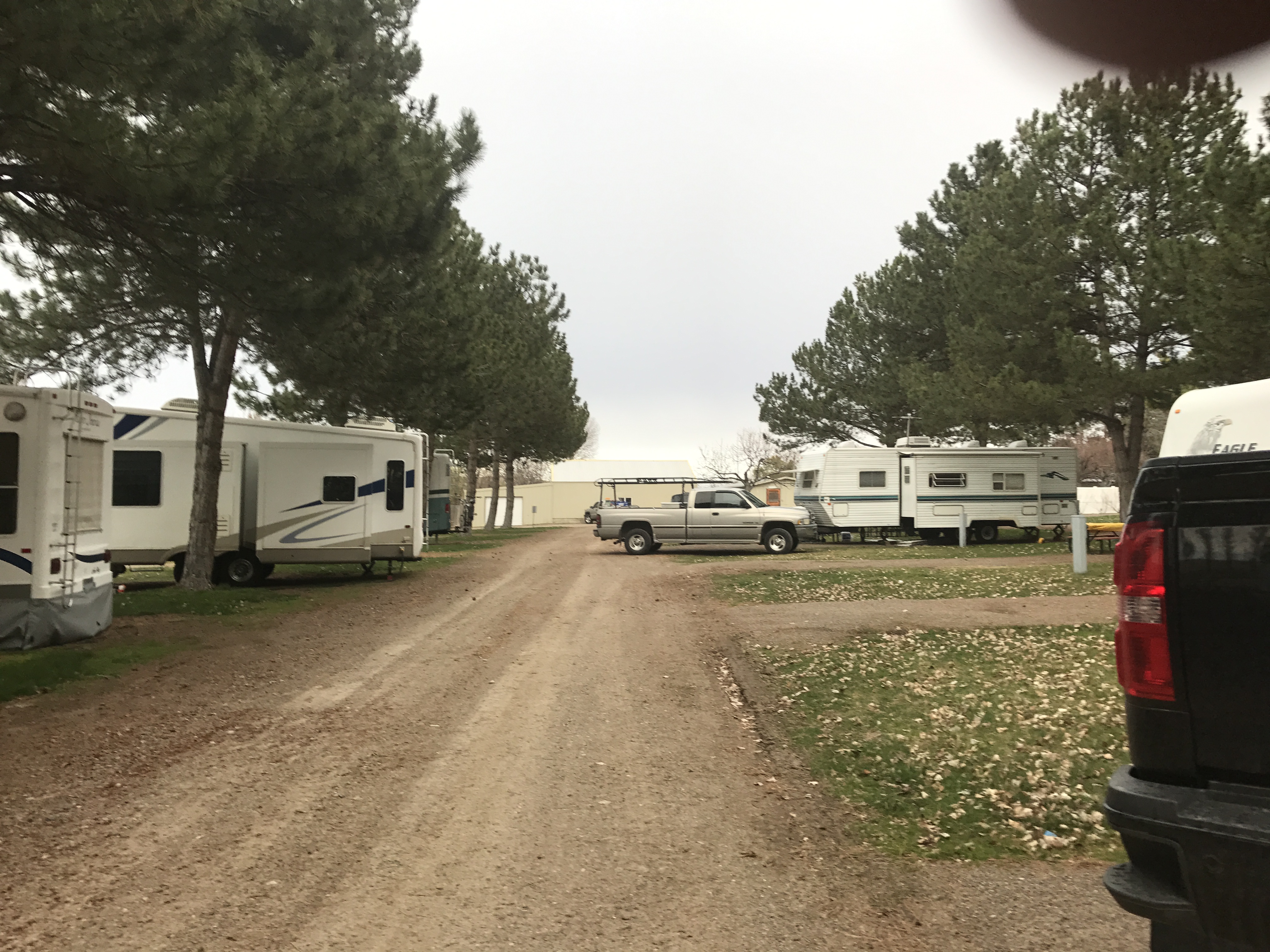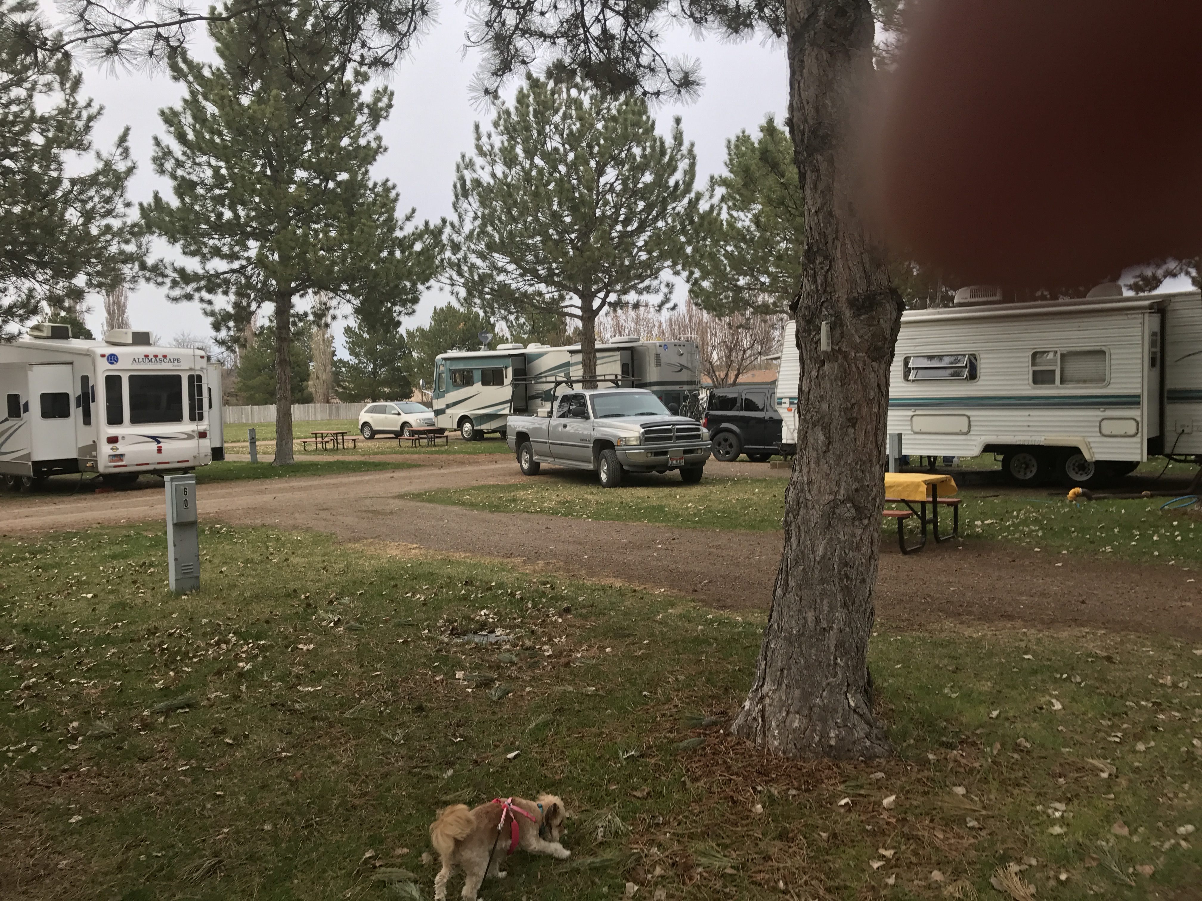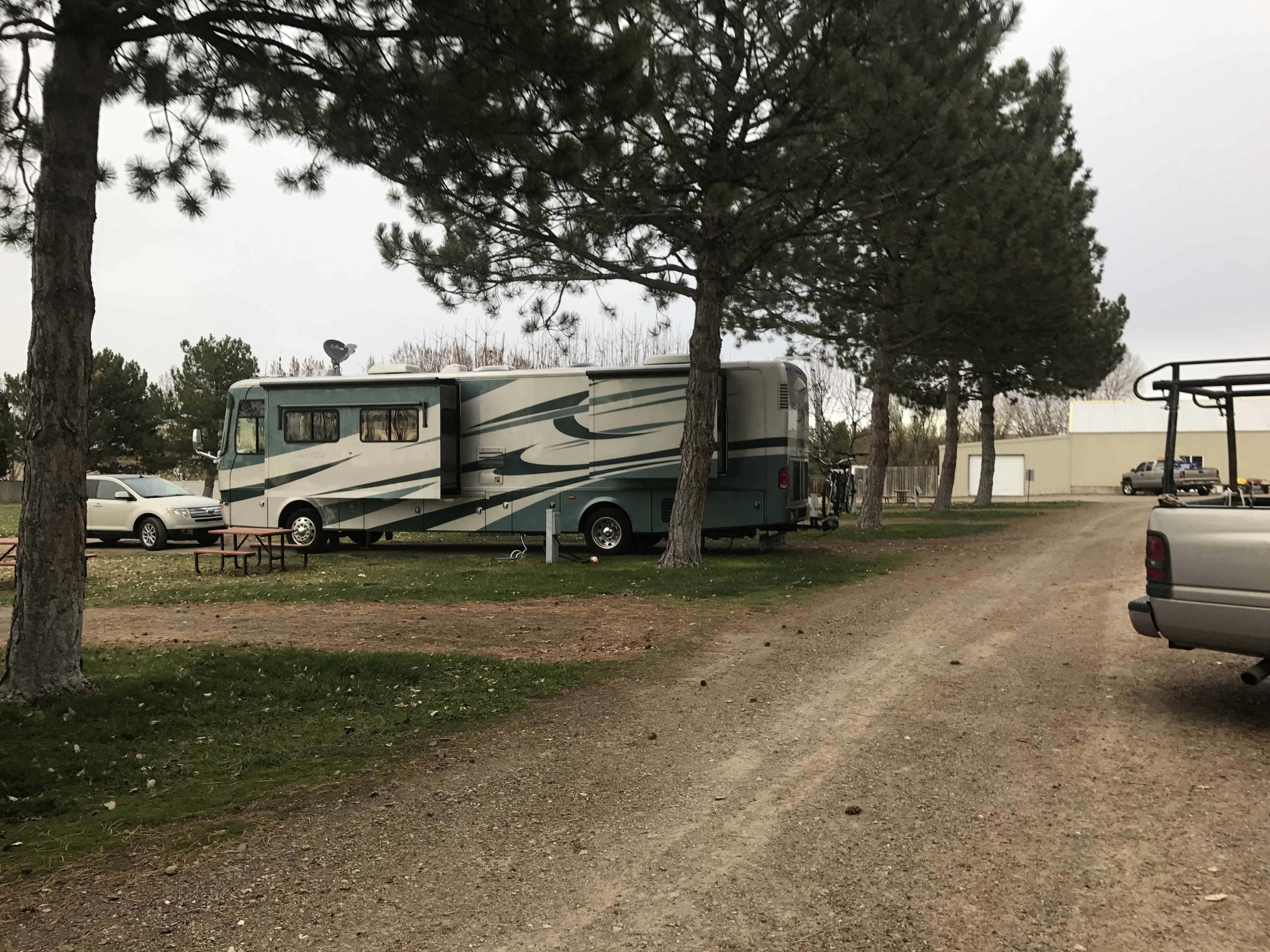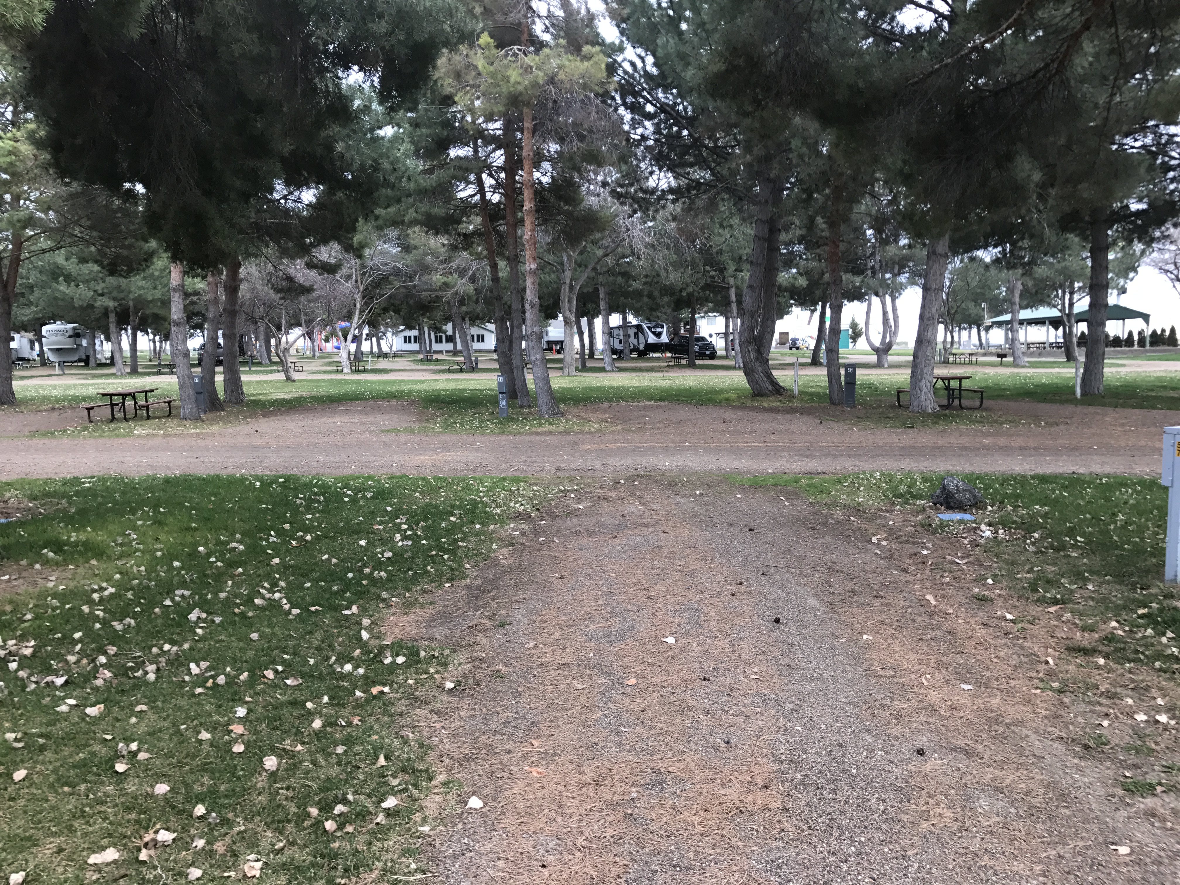 Setting: Dirt pull-through sites, we had only needed a little front to back leveling; the shade, grass, tables and centered hookup ‘island’ are well thought out and organized. There is no cable TV and the WiFi is extra ($20.00/7 days). The roads are in the park are dusty (or muddy rained 3 out of the 6 days we were there). The park was quiet with nice lawn areas. Easy on and off access to I-84.