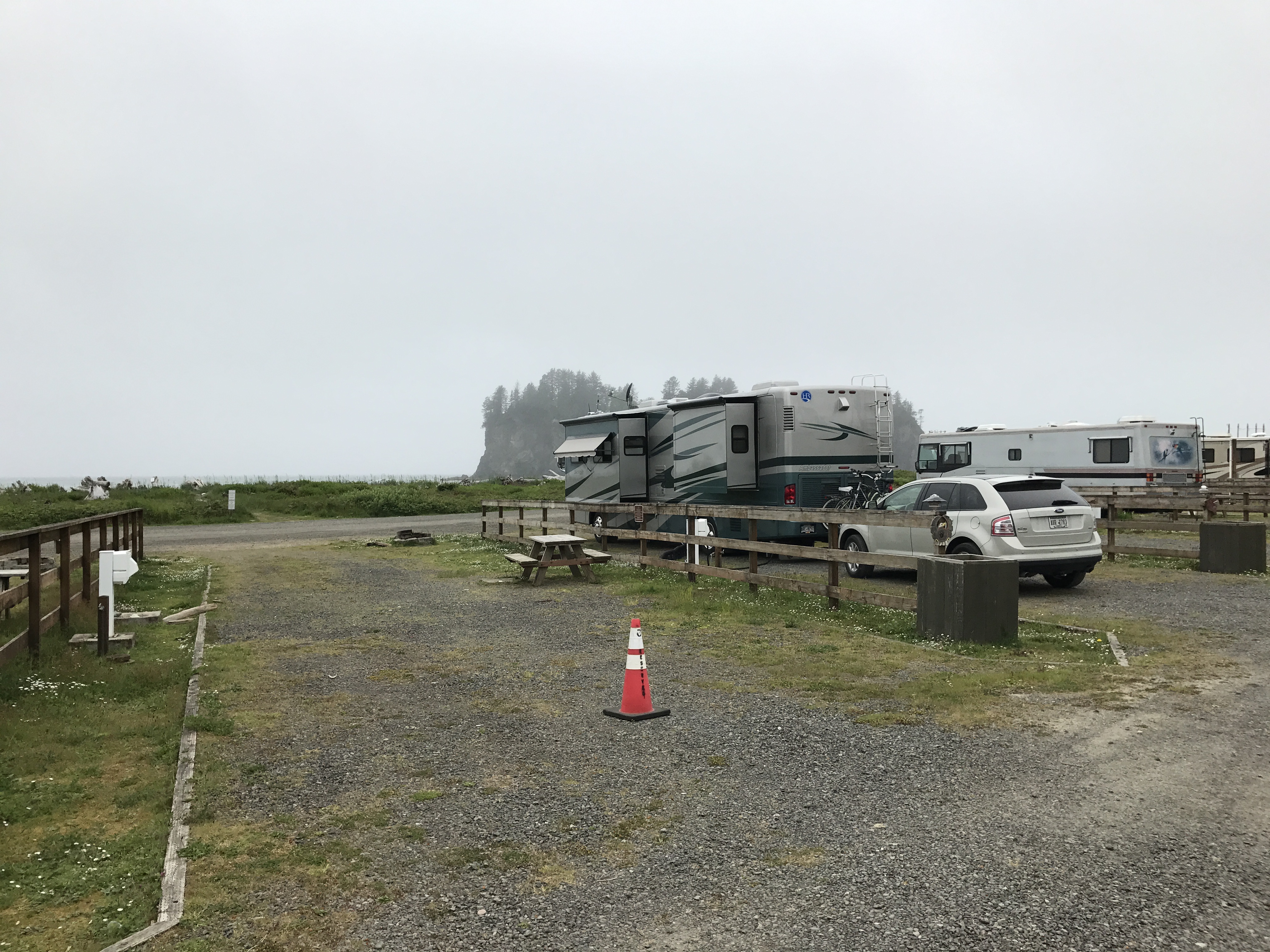 Setting: The beach here is a 10 with a great views from our motorhome. The sites were roomy and most were suitable for big rigs. The power and hookups worked well. You can have fires on the beach but the sign says a permit is required. This is a remote area and there is not much in town, the restaurant was closed during our visit but there is a small store on the south side of the campground that had supplies. Second & Third beaches are nearby and worth the hike of about a 1.4 miles. Rialto beach was closed for road repair so we were not able to get the beach. No AT&T Cell service but Wifi was available at office at dial up speeds .This is setup like two different campgrounds with sites on the north being mainly gravel pull-thrus with some grass and a fence between each, unlevel but with a good view. Some have sewer hook-ups on both sides. The part south of the store is more basic. All gravel back-ins with hook-ups and also. Many tent sites are sandwiched in back of the ocean front sites. There are a few toilets and showers back at the store and there are some construction site style portable toilets scattered around. I liked the North side best as it had better separation but hard to get level but the beautiful sunsets is why we came and this location delivered.